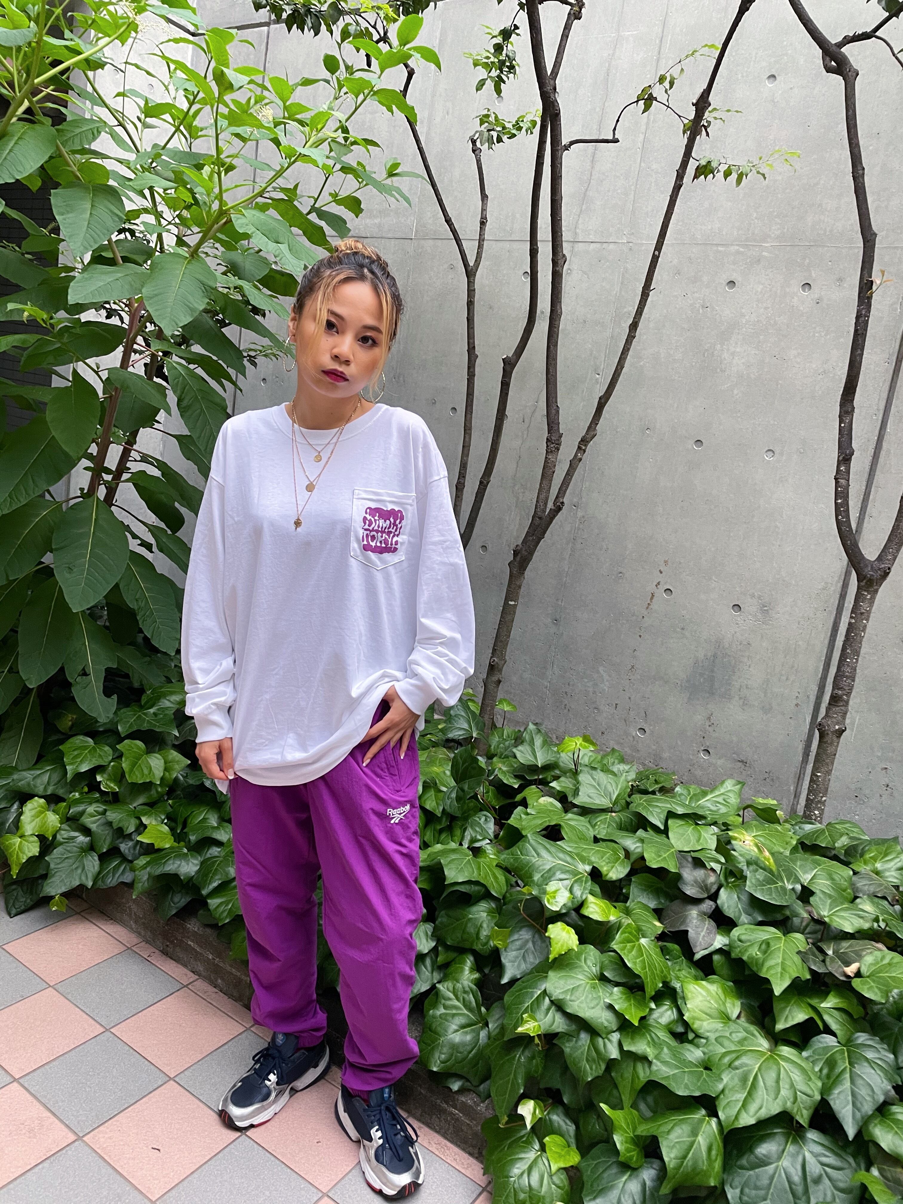 左胸のポケット部分には毒々しさを表現した『Dimly tokyo』の文字を赤紫色でプリント。