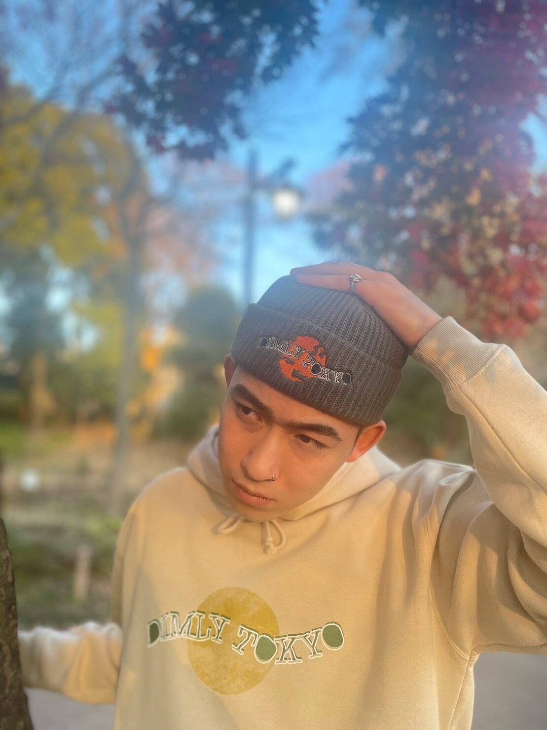 宇宙に浮かぶ惑星を描いた、ロゴデザインを刺繍であしらったニットキャップ。